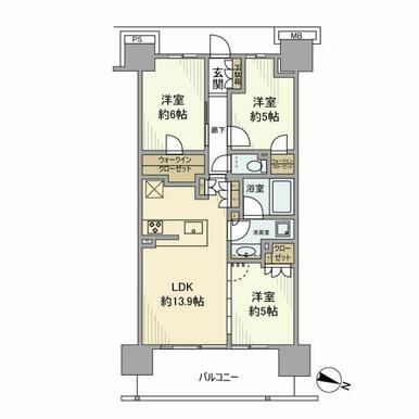 3LDK(LDK13.9、洋5、洋5、洋6) |